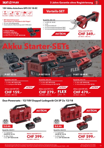 Die Ausstattung der Maschinen entspricht der %u00fcblichen Grundausstattung. Technische %u00c4nderungen, Preis%u00e4nderungen und Irrtum vorbehalten. Alle Preise verstehen sich als unverbindliche Preisempfehlung exkl. MwSt. + vRB. 13 Aktion g%u00fcltig bis 31.03.2026Nur solange der Vorrat reicht3 Jahre Garantie ohne RegistrierungAkku Starter-SETsAktion statt CHF 299.%u2013CHF 159.%u2013exkl. MwSt. + vRB (1.46)Aktion statt CHF 413.%u2013CHF 279.%u2013exkl. MwSt. + vRB (2.16)Aktion statt CHF 625.%u2013CHF 479.%u2013exkl. MwSt. + vRB (2.16)Bestell-Nr. 532.740%u0083 2x Akku AP 18/2.5 Ah%u0083 1x Ladeger%u00e4t CA 18-LDBestell-Nr. 532.739%u0083 2x Akku AP 18/5.0 Ah%u0083 1x Schnellladeger%u00e4t CA 12/18Bestell-Nr. 533.175%u0083 2x Akku AP 18/8.0 Ah%u0083 1x Schnellladeger%u00e4t CA 12/18P-SET 22 Q P-SET 55 R P-SET 18-88 RBestell-Nr. 535.133%u0083 1x GPS 35 18-EC%u0083 1x %u00d6l%u0083 1x Spannschl%u00fcssel%u0083 1x Innensechskantschl%u00fcssel SW2%u0083 1x Innensechskantschl%u00fcssel SW4%u0083 Mit Sicherheitssensor! Zum Schutz vor Schnitten in die Finger!%u0083 35 mm Schnittkapazit%u00e4t%u0083 Automatische Abschaltung nach 3 Minuten18V Akku-Astschere GPS 35 18-ECIn dieser Aktion zus%u00e4tzlich enthalten:1x Ladeger%u00e4t CA 18-LD2x Akku-Pack Li-Ion AP 18/2.5 AhBestell-Nr. 534.911%u0083 1x Ladeger%u00e4t CA SP 2x 12/18%u0083 2x Akku-Packs Li-Ion AP 18.0/5.0 AhBestell-Nr. 534.912%u0083 1x Ladeger%u00e4t CA SP 2x 12/18%u0083 2x Akku-Packs Li-Ion AP 18.0/8.0 AhDuo-Powersets %u2013 12/18V Doppel-Ladeger%u00e4t CA SP 2x 12/185.0 Ah 8.0 AhAktion statt CHF 517.%u2013CHF 399.%u2013exkl. MwSt. + vRB (2.16)Aktion statt CHF 729.%u2013CHF 599.%u2013exkl. MwSt. + vRB (2.16)Vorteils-SETAktion statt CHF 399.%u2013CHF 349.%u2013exkl. MwSt. + vRB (2.16)