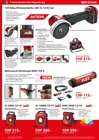 14 Die Ausstattung der Maschinen entspricht der %u00fcblichen Grundausstattung. Technische %u00c4nderungen, Preis%u00e4nderungen und Irrtum vorbehalten. Alle Preise verstehen sich als unverbindliche Preisempfehlung exkl. MwSt. + vRB.Aktion g%u00fcltig bis 31.03.2026Nur solange der Vorrat reicht3 Jahre Garantie ohne Registrierung12V Akku-Winkelschleifer LBE 76 12-EC Set%u0083 B%u00fcrstenloser Motor%u0083 Sanftanlauf, Wiederanlaufsperre%u0083 Temperatur%u00fcberwachung%u0083 %u00dcberlastungsschutz%u0083 Elektronische Bremse%u0083 Anti-KickbackUm 180%u00b0 drehbarer Kopf, zum Trennen ideal f%u00fcr Rechts-/Linksh%u00e4nder. Zum Schleifen eignet sich die 90%u00b0 Position.Vorw%u00e4rts- und R%u00fcckw%u00e4rtslauf f%u00fcr ziehenden oder schiebender Schnitt und zur Steuerung des Funkenflugs.Absaugung (Lieferumfang) direkt am Trennschutzhauben-Clip ansteckbar.Variable Geschwindigkeitseinstellung in 4 Stufen:5000 / 10000 / 15000 / 20000 U/minIntegriertes LED-Licht an zwei Positionen mit Nachleuchtfunktion.Bestell-Nr. 535.121%u0083 1x LBE 76 12-EC im Karton%u0083 1x Ladeger%u00e4t CA 12%u0083 1x Akku-Pack Li-Ion AP 12/5.0 Ah%u0083 1x Schutzhaube%u0083 1x Trennschutz-Haube Clip%u0083 1x G%u00fcrtelclip%u0083 1x Adapter f%u00fcr Staubabsaugung %u00d8 32 mm%u0083 2x Metalltrennscheiben M-CD 76/ INOX (1 mm)%u0083 1x Multi Material Carbide-Scheibe CA-CD 76/1.8%u0083 1x Schruppscheibe Metall M-GD 76/4 (4 mm)%u0083 1x TragetascheAktion statt CHF 506.%u2013CHF 319.%u2013exkl. MwSt. + vRB (2.16)Lampe mit multifunktionellen Beleuchtungsm%u00f6glichkeiten, Verwendung mit Stirnband oder als SpotLight mit dem Kappen-Clip.Bestell-Nr. 534.476%u0083 1x USB-Ladekabel%u0083 1x Stirnband%u0083 2x HalterungMehrzweck-Stirnlampe MWL 150 4%u0083 Montierbar auf dem Akku-Polierer PXE 80%u0083 All-Daylight-Funktion 2500-6500 K%u0083 2 Helligkeitsstufen, 300 Lumen und 150 Lumen%u0083 Mit integrierten Magneten%u0083 USB-C Ladeanschluss 12 WNeuheitCHF 115.%u2013exkl. MwSt. + vRB (0.56)CL 5000 12/18Bestell-Nr. 504.602CL 10000 12/18Bestell-Nr. 504.610CHF 215.%u2013exkl. MwSt. + vRB (0.56)CHF 360.%u2013exkl. MwSt. + vRB (0.56)DWL 2500 12/18Bestell-Nr. 486.728CHF 250.%u2013exkl. MwSt. + vRB (0.56)%u0083 Akku-Baustrahler%u0083 5000 Lumen%u0083 5 Helligkeitsstufen%u0083 Drehbar 120%u00b0%u0083 Akku-Baustrahler%u0083 10000 Lumen%u0083 5 Helligkeitsstufen%u0083 Drehbar 120%u00b0%u0083 Vollspektrumleuchte%u0083 Farbtemperatur2500 %u2013 6500K%u0083 Max. 3000 LumenALL DAYLIGHT - 5 step2500K 6500KWARM COLD