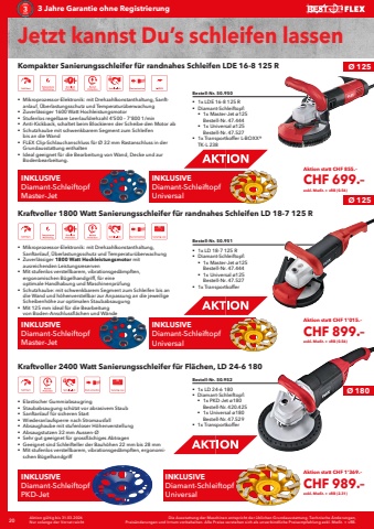 20 Die Ausstattung der Maschinen entspricht der %u00fcblichen Grundausstattung. Technische %u00c4nderungen, Preis%u00e4nderungen und Irrtum vorbehalten. Alle Preise verstehen sich als unverbindliche Preisempfehlung exkl. MwSt. + vRB.Aktion g%u00fcltig bis 31.03.2026Nur solange der Vorrat reicht3 Jahre Garantie ohne RegistrierungKompakter Sanierungsschleifer f%u00fcr randnahes Schleifen LDE 16-8 125 R%u0083 Mikroprozessor-Elektronik: mit Drehzahlkonstanthaltung, Sanftanlauf, %u00dcberlastungsschutz und Temperatur%u00fcberwachung%u0083 Zuverl%u00e4ssiger 1600 Watt Hochleistungsmotor%u0083 Stufenlos regelbare Leerlaufdrehzahl 4%u2018500 %u2013 7%u2018800 1/min%u0083 Anti-Kickback, schaltet beim Blockieren der Scheibe den Motor ab%u0083 Schutzhaube mit schwenkbarem Segment zum Schleifen bis an die Wand%u0083 FLEX Clip-Schlauchanschluss f%u00fcr %u00d8 32 mm Rastanschluss in der Grundausstattung enthalten%u0083 Ideal geeignet f%u00fcr die Bearbeitung von Wand, Decke und zur Bodenbearbeitung. Bestell-Nr. 50.950%u0083 1x LDE 16-8 125 R%u0083 Diamant-Schleiftopf:%u0083 1x Master-Jet %u00f8125Bestell-Nr. 47.444%u0083 1x Universal %u00f8125Bestell-Nr. 47.527%u0083 1x Transportkoffer L-BOXX%u00ae TK-L 238%u00d8 125INKLUSIVEDiamant-SchleiftopfMaster-JetINKLUSIVEDiamant-SchleiftopfUniversalKraftvoller 1800 Watt Sanierungsschleifer f%u00fcr randnahes Schleifen LD 18-7 125 R%u0083 Mikroprozessor-Elektronik: mit Drehzahlkonstanthaltung, Sanftanlauf, %u00dcberlastungsschutz und Temperatur%u00fcberwachung%u0083 Zuverl%u00e4ssiger 1800 Watt Hochleistungsmotor mit ausreichenden Leistungsreserven%u0083 Mit stufenlos verstellbarem, vibrationsged%u00e4mpften, ergonomischen B%u00fcgelhandgriff, f%u00fcr eine optimale Handhabung und Maschinenpr%u00fcfung%u0083 Schutzhaube: mit schwenkbarem Segment zum Schleifen bis an die Wand und h%u00f6henverstellbar zur Anpassung an die jeweilige Scheibenh%u00f6he zur optimalen Staubabsaugung%u0083 Mit 125 mm ideal f%u00fcr die Bearbeitung von Boden-Anschlussfl%u00e4chen und W%u00e4ndeBestell-Nr. 50.951%u0083 1x LD 18-7 125 R%u0083 Diamant-Schleiftopf:%u0083 1x Master-Jet %u00f8125Bestell-Nr. 47.444%u0083 1x Universal %u00f8125Bestell-Nr. 47.527%u0083 1x Transportkoffer%u00d8 125INKLUSIVEDiamant-SchleiftopfMaster-JetINKLUSIVEDiamant-SchleiftopfUniversalKraftvoller 2400 Watt Sanierungsschleifer f%u00fcr Fl%u00e4chen, LD 24-6 180%u0083 Elastischer Gummiabsaugring%u0083 Staubabsaugung sch%u00fctzt vor abrasivem Staub%u0083 Sanftanlauf f%u00fcr sicheren Start%u0083 Wiederanlaufsperre nach Stromausfall%u0083 Absaughaube mit stufenloser H%u00f6henverstellung%u0083 Absaugstutzen 32 mm Aussen-%u00d8%u0083 Sehr gut geeignet f%u00fcr grossfl%u00e4chiges Abtragen%u0083 Geeignet sind Schleifteller der Bauh%u00f6hen 22 mm bis 28 mm %u0083 Mit stufenlos verstellbarem, vibrationsged%u00e4mpften, ergonomischen B%u00fcgelhandgriffBestell-Nr. 50.952%u0083 1x LD 24-6 180%u0083 Diamant-Schleiftopf:%u0083 1x PKD-Jet %u00f8180Bestell-Nr. 420.425 %u0083 1x Universal %u00f8180 Bestell-Nr. 47.529%u0083 1x Transportkoffer%u00d8 180INKLUSIVEDiamant-SchleiftopfPKD-JetINKLUSIVEDiamant-SchleiftopfUniversalJetzt kannst Du%u2019s schleifen lassenAktion statt CHF 1%u2019369.%u2013CHF 989.%u2013exkl. MwSt. + vRB (2.31)Aktion statt CHF 1%u2019015.%u2013CHF 899.%u2013exkl. MwSt. + vRB (0.56)Aktion statt CHF 855.%u2013CHF 699.%u2013exkl. MwSt. + vRB (0.56)