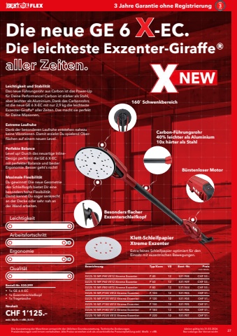 Die Ausstattung der Maschinen entspricht der %u00fcblichen Grundausstattung. Technische %u00c4nderungen, Preis%u00e4nderungen und Irrtum vorbehalten. Alle Preise verstehen sich als unverbindliche Preisempfehlung exkl. MwSt. + vRB. 27 Aktion g%u00fcltig bis 31.03.2026Nur solange der Vorrat reicht3 Jahre Garantie ohne RegistrierungDie neue GE 6 X-EC.Die leichteste Exzenter-Giraffe%u00ae aller Zeiten.Leichtigkeit und Stabilit%u00e4tDas neue F%u00fchrungsrohr aus Carbon ist das Power-Up f%u00fcr Deine Performance! Carbon ist st%u00e4rker als Stahl, aber leichter als Aluminium. Dank des Carbonrohrs ist die neue GE 6 X-EC mit nur 2,9 kg die leichteste Exzenter-Giraffe%u00ae aller Zeiten. Das macht sie perfekt f%u00fcr Deine Missionen.Extreme Laufruhe Dank der besonderen Laufruhe entstehen nahezu keine Vibrationen. Damit erzielst Du spielend Oberfl%u00e4chen auf einem neuen Level.Perfekte BalanceLevel up! Durch das neuartige InlineDesign performt die GE 6 X-EC mit perfekter Balance und bester Ergonomie. Besser geht's nicht!Maximale Flexibilit%u00e4tDu gewinnst! Die neue Geometrie des Schleifkopfs bietet Dir eine besonders hohe Flexibilit%u00e4t. Damit kannst Du sogar senkrecht an der Decke oder sehr nah an der Wand arbeiten.LeichtigkeitArbeitsfortschrittErgonomieQualit%u00e4tBestell-Nr. 530.299%u0083 1x GE 6 X-EC%u0083 1x Exzenterschleifkopf %u0083 1x TragetascheNeuheitCHF 1%u2019125.%u2013exkl. MwSt. + vRB. (0.56)Besonders flacher ExzenterschleifkopfCarbon-F%u00fchrungsrohr40% leichter als Aluminium10x h%u00e4rter als Stahl160%u02da SchwenkbereichB%u00fcrstenloser MotorKlett-SchleifpapierXtreme ExzenterExtra feines Schleifpapier optimiert f%u00fcr den Einsatz mit exzentrischen Bewegungen.Bezeichnung Typ/Korn VE Best.-Nr. Preis exkl. MwSt.D225-10 MF-P40 VE12 Xtreme Exzenter P 40 12 531.908 CHF 53.%u2013D225-10 MF-P60 VE12 Xtreme Exzenter P 60 12 531.909 CHF 53.%u2013D225-10 MF-P80 VE12 Xtreme Exzenter P 80 12 531.544 CHF 53.%u2013D225-10 MF-P100 VE12 Xtreme Exzenter P 100 12 531.903 CHF 51.%u2013D225-10 MF-P120 VE12 Xtreme Exzenter P 120 12 531.904 CHF 51.%u2013D225-10 MF-P150 VE12 Xtreme Exzenter P 150 12 531.905 CHF 51.%u2013D225-10 MF-P180 VE12 Xtreme Exzenter P 180 12 531.906 CHF 51.%u2013D225-10 MF-P220 VE12 Xtreme Exzenter P 220 12 531.907 CHF 51.%u2013
