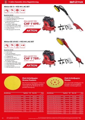 28 Die Ausstattung der Maschinen entspricht der %u00fcblichen Grundausstattung. Technische %u00c4nderungen, Preis%u00e4nderungen und Irrtum vorbehalten. Alle Preise verstehen sich als unverbindliche Preisempfehlung exkl. MwSt. + vRB.Aktion g%u00fcltig bis 31.03.2026Nur solange der Vorrat reicht3 Jahre Garantie ohne RegistrierungBestell-Nr. 50.942%u0083 1x Giraffe%u00ae GE 5 im Karton%u0083 1x Clip-Schnellspannring SH-FC 32%u0083 1x VCE 44 L AC (42 L)%u0083 1x Antistatik-Saugschlauch%u00d8 32 mm x 4.0 m%u0083 1x L-BOXX%u00ae Halterung%u0083 1x Flachfaltenfilter PES L/M/H%u0083 1x Vlies-Filtersack Klasse L/M%u0083 1x Schlauchhalter%u0083 1x Reinigungsset CLE 32 ASAktion GE 5 + VCE 44 L AC-SETAktion statt CHF 1%u2019850.%u2013CHF 1%u2019499.%u2013exkl. MwSt. + vRB (5.56)Bestell-Nr. 50.935%u0083 1x GE 6 R-EC%u0083 1x Rundschleifkopf mit drehbarem Randsegment%u0083 1x Tragetasche%u0083 1x VCE 44 L AC (42 L)%u0083 1x Antistatik-Saugschlauch%u00d8 32 mm x 4.0 m%u0083 1x L-BOXX%u00ae Halterung%u0083 1x Flachfaltenfilter PES L/M/H%u0083 1x Vlies-Filtersack Klasse L/M%u0083 1x Schlauchhalter%u0083 1x Reinigungsset CLE 32 ASAktion GE 6 R-EC + VCE 44 L AC-SETAktion statt CHF 1%u2019910.%u2013CHF 1%u2019789.%u2013exkl. MwSt. + vRB (5.56)Klett-SchleifpapierXtreme PremiumDas Premium-Schleifpapier bietet eine herausragende Oberfl%u00e4chenqualit%u00e4t und sorgt mit der Multihole f%u00fcr eine perfekte Absaugung.Klett-SchleifpapierXtremeDas universelle Schleifpapier f%u00fcr schnelles und wirtschaftliche Arbeiten mit Absaugl%u00f6chern.Bezeichnung Typ/Korn VE Best.-Nr. Preis exkl. MwSt.D225 PF-P40 VE25 Xtreme Premium P 40 25 280.739 CHF 124.%u2013D225 PF-P60 VE25 Xtreme Premium P 60 25 260.233 CHF 124.%u2013D225 PF-P80 VE25 Xtreme Premium P 80 25 260.234 CHF 124.%u2013D225 PF-P100 VE25 Xtreme Premium P 100 25 260.235 CHF 119.%u2013D225 PF-P120 VE25 Xtreme Premium P 120 25 282.405 CHF 119.%u2013D225 PF-P150 VE25 Xtreme Premium P 150 25 311.995 CHF 119.%u2013D225 PF-P180 VE25 Xtreme Premium P 180 25 311.987 CHF 119.%u2013D225 PF-P220 VE25 Xtreme Premium P 220 25 260.236 CHF 119.%u2013Bezeichnung Typ/Korn VE Best.-Nr. Preis exkl. MwSt.D225-10 SF-P24 VE12 Xtreme P 24 12 531.542 CHF 74.%u2013D225-10 SF-P40 VE12 Xtreme P 40 12 531.900 CHF 34.%u2013D225-10 SF-P60 VE12 Xtreme P 60 12 531.901 CHF 33.%u2013D225-10 SF-P80 VE12 Xtreme P 80 12 531.902 CHF 33.%u2013D225-10 SF-P100 VE12 Xtreme P 100 12 531.896 CHF 31.%u2013D225-10 SF-P120 VE12 Xtreme P 120 12 531.897 CHF 31.%u2013D225-10 SF-P150 VE12 Xtreme P 150 12 531.898 CHF 31.%u2013D225-10 SF-P180 VE12 Xtreme P 180 12 531.543 CHF 31.%u2013D225-10 SF-P220 VE12 Xtreme P 220 12 531.899 CHF 31.%u2013