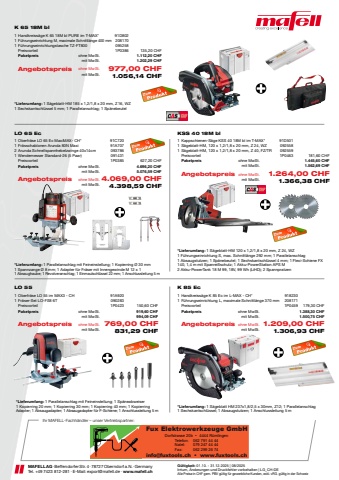 K 65 18M blLO 65 Ec KSS 40 18M blLO 55 K 85 EcIhr MAFELL-Fachh%u00e4ndler %u2013 unser Vertriebspartner:G%u00fcltigkeit: 01.10. - 31.12.2025 | 08/2025Irrtum, %u00c4nderungen und Druckfehler vorbehalten | LG_CH-DE Alle Preise in CHF gem. PBV g%u00fcltig f%u00fcr gewerbliche Kunden, exkl. vRG. g%u00fcltig in der SchweizMAFELL AG %u00b7 Beffendorfer Str. 4 %u00b7 78727 Oberndorf a.N. %u00b7 GermanyTel. +49 7423 812-281 %u00b7 E-Mail: export@mafell.de %u00b7 www.mafell.ch1 Oberfr%u00e4se LO 55 im MAX3 - CH 91A9201 Fr%u00e4ser-Set LO-FS8 6T 090283Preisvorteil 1P0423 150,60 CHF Paketpreis ohne MwSt. 919,60 CHF mit MwSt. 994,09 CHFAngebotspreis ohne MwSt. 769,00 CHFmit MwSt. 831,29 CHF*Lieferumfang: 1 Parallelanschlag mit Feineinstellung; 1 Sp%u00e4neabweiser1 Kopierring 20 mm; 1 Kopierring 30 mm; 1 Kopierring 40 mm; 1 Kopierring Adapter; 1 Absaugadapter; 1 Absaugadapter f%u00fcr F-Schiene; 1 Anschlussleitung 5 m*Lieferumfang: 1 Parallelanschlag mit Feineinstellung; 1 Kopierring %u00d8 30 mm 1 Spannzange %u00d8 8 mm; 1 Adapter f%u00fcr Fr%u00e4ser mit Innengewinde M 12 x 11 Absaughaube; 1 Revolveranschlag; 1 Einmaulschl%u00fcssel 22 mm; 1 Anschlussleitung 5 m 1 Oberfr%u00e4se LO 65 Ec MaxiMAX- CH* 91C7201 Fr%u00e4sschablonen Arunda 80N Maxi 91A7072 Arunda Schnellspannhebelzwinge 40x14cm 0937861 Wendemesser Standard-26 (5 Paar) 091431Preisvorteil 1P0385 627,20 CHF Paketpreis ohne MwSt. 4.696,20 CHF mit MwSt. 5.076,59 CHFAngebotspreis ohne MwSt. 4.069,00 CHFmit MwSt. 4.398,59 CHF1 Kappschienen-S%u00e4ge KSS 40 18M bl im T-MAX* 91D5011 S%u00e4geblatt-HM, 120 x 1,2/1,8 x 20 mm, Z 24, WZ 0925581 S%u00e4geblatt-HM, 120 x 1,2/1,8 x 20 mm, Z 40, FZ/TR 092559Preisvorteil 1P0463 181,60 CHF Paketpreis ohne MwSt. 1.445,60 CHF mit MwSt. 1.562,69 CHFAngebotspreis ohne MwSt. 1.264,00 CHFmit MwSt. 1.366,38 CHF1 Handkreiss%u00e4ge K 65 18M bl PURE im T-MAX* 91D8021 F%u00fchrungseinrichtung M, maximale Schnittl%u00e4nge 400 mm 2081701 F%u00fchrungseinrichtungstasche TZ-FT800 095258Preisvorteil 1P0386 135,20 CHF Paketpreis ohne MwSt. 1.112,20 CHF mit MwSt. 1.202,29 CHFAngebotspreis ohne MwSt. 977,00 CHFmit MwSt. 1.056,14 CHF*Lieferumfang: 1 S%u00e4geblatt-HM 185 x 1,2/1,8 x 20 mm, Z16, WZ1 Sechskantschl%u00fcssel 5 mm; 1 Parallelanschlag; 1 Sp%u00e4nebeutel*Lieferumfang: 1 S%u00e4geblatt-HM 120 x 1,2/1,8 x 20 mm, Z 24, WZ1 F%u00fchrungseinrichtung S, max. Schnittl%u00e4nge 292 mm; 1 Parallelanschlag1 Absaugstutzen; 1 Sp%u00e4nebeutel; 1 Sechskantschl%u00fcssel 4 mm; 1 Flexi-Schiene FX 140, 1,4 m mit Spanrei%u00dfschutz; 1 Akku-PowerStation APS M2 Akku-PowerTank 18 M 99, 18V, 99 Wh (LiHD); 2 Spannpratzen 1 Handkreiss%u00e4ge K 85 Ec im L-MAX - CH* 9182301 F%u00fchrungseinrichtung L, maximale Schnittl%u00e4nge 370 mm 208171Preisvorteil 1P0459 179,30 CHF Paketpreis ohne MwSt. 1.388,30 CHF mit MwSt. 1.500,75 CHFAngebotspreis ohne MwSt. 1.209,00 CHFmit MwSt. 1.306,93 CHF*Lieferumfang: 1 S%u00e4geblatt HM 237x1,8/2,5 x 30mm, Z12; 1 Parallelanschlag1 Sechskantschl%u00fcssel; 1 Absaugstutzen; 1 Anschlussleitung 5 mFux Elektrowerkzeuge GmbHinfo@fuxtools.ch %u2022 www.fuxtools.chDorfstrasse 20b %u2022 4444 R%u00fcmlingen062 791 44 44079 247 44 44062 299 26 74Telefon:Natel:Fax: