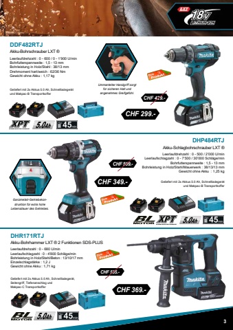CHF 349.- CHF 299.- CHF 429.- CHF 509.- CHF 369.- CHF 535.-DDF482RTJAkku-Bohrschrauber LXT %u00aeLeerlaufdrehzahl : 0 - 600 / 0 - 1%u2019900 U/minBohrfutterspannweite : 1,5 - 13 mmBohrleistung in Holz/Stahl : 38/13 mmDrehmoment hart/weich : 62/36 NmGewicht ohne Akku : 1,17 kgGeliefert mit 2x Akkus 5.0 Ah, Schnellladeger%u00e4t und Makpac-B TransportkofferDHR171RTJAkku-Bohrhammer LXT %u00ae 2 Funktionen SDS-PLUSLeerlaufdrehzahl : 0 - 680 U/minLeerlaufschlagzahl : 0 - 4%u2019800 Schl%u00e4ge/minBohrleistung in Holz/Stahl/Beton : 13/10/17 mmEinzelschlagst%u00e4rke : 1,2 JGewicht ohne Akku : 1,71 kgGeliefert mit 2x Akkus 5.0 Ah, Schnellladeger%u00e4t, Seitengriff, Tiefenanschlag und Makpac-C TransportkofferDHP484RTJAkku-Schlagbohrschrauber LXT %u00aeLeerlaufdrehzahl : 0 - 500 / 2%u2019000 U/minLeerlaufschlagzahl : 0 - 7%u2019500 / 30%u2019000 Schl%u00e4ge/minBohrfutterspannweite : 1,5 - 13 mmBohrleistung in Holz/Stahl/Mauerwerk : 38/13/13 mm Gewicht ohne Akku : 1,25 kgGeliefert mit 2x Akkus 5.0 Ah, Schnellladeger%u00e4t und Makpac-B TransportkofferGanzmetall-Getriebekonstruktion f%u00fcr extra hohe Lebensdauer des Getriebes.Ummantelter Handgriff sorgt f%u00fcr sicheren Halt und angenehmes Greifgef%u00fchl.3