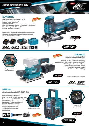 +CHF 409.- CHF 595.- CHF 159.- CHF 239.- CHF 299.- CHF 439.-Akku-Maschinen 18VDMR301Akku-Baustellenradio LXT %u00ae/CXT %u00ae/ACFrequenzbereich FM/ DAB+ : 87,5 - 108 MHz/ 174,928 - 239,200 MHzBetriebsdauer mit 18V / 6,0 Ah : 24,5 hSchutzklasse : IP64Abmessung : 268 x 185 x 305 mmGewicht ohne Akku : 5,97 kgGeliefert mit Netz-Adaptater 230V, + 1x Akku 3.0 Ah (Art. 632G12-3), ohne Lageger%u00e4tDBO382ZAkku-Schwingschleife LXT %u00aeHubzahl : 8%u2019000 / 16%u2019000 / 24%u2019000 min-1Vibrationen pro Min. : 4%u2019000 / 8%u2019000 / 12%u2019000 min-1Schleifpapiergr%u00f6sse : 93 x 228 mm Schwingkreisdurchmesser : 2 mmMaximale Leistung : 200 WGewicht ohne Akku : 1,59 kgGeliefert ohne Akku, ohne Ladeger%u00e4tDJV181RTJAkku-Pendelhubstichs%u00e4ge LXT %u00aeHubzahl : 800 - 3%u2019500 min-1Hubh%u00f6he : 26 mmMax. Schnittleistung Holz 90%u00b0/ Weichstahl : 135/10 mmMax. Neigungswinkel R : 0 - 45%u00b0Gewicht ohne Akku : 1,94 kgGeliefert mit 2x Akkus 5.0 Ah, Schnellladeger%u00e4t, 6 assortierten S%u00e4gebl%u00e4tter, Absaugstutzen, Kunststoffgleitplatte, Schl%u00fcssel und ein Makpac-C TransportkofferDesign und Griff f%u00fcr gute Handhabung.Mit Akku-Ladefunktion.1x Akku 3.0 Ah (Art. 632G12-3).4