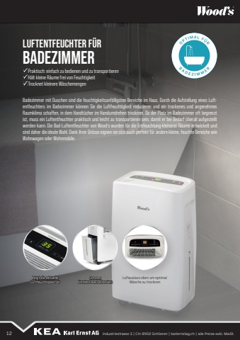 LUFTENTFEUCHTER F%u00dcRBADEZIMMERBadezimmer mit Duschen sind die feuchtigkeitsanf%u00e4lligsten Bereiche im Haus. Durch die Aufstellung eines Luftentfeuchters im Badezimmer k%u00f6nnen Sie die Luftfeuchtigkeit reduzieren und ein trockenes und angenehmes Raumklima schaffen, in dem Handt%u00fccher im Handumdrehen trocknen. Da der Platz im Badezimmer oft begrenzt ist, muss ein Luftentfeuchter praktisch und leicht zu transportieren sein, damit er bei Bedarf %u00fcberall aufgestellt werden kann. Die Bad-Luftentfeuchter von Wood%u2018s wurden f%u00fcr die Entfeuchtung kleinerer R%u00e4ume entwickelt und sind daher die ideale Wahl. Dank ihrer Gr%u00f6sse eignen sie sich auch perfekt f%u00fcr andere kleine, feuchte Bereiche wie Wohnwagen oder Wohnmobile.Praktisch: einfach zu bedienen und zu transportierenH%u00e4lt kleine R%u00e4ume frei von FeuchtigkeitTrocknet kleinere W%u00e4schemengenZeigt die aktuelleLuftfeuchtigkeit an Luftauslass oben um optimal W%u00e4sche zu trocknenGrossesKondenswasserbecken12 Industriestrasse 3 | CH-8952 Schlieren | karlernstag.ch | alle Preise exkl. MwSt.