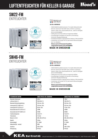 LUFTENTFEUCHTER F%u00dcR KELLER & GARAGEArt.Nr. 6020010%u2013 SWISS MADE Qualit%u00e4tssensoren: F%u00fcr exakte Abtauintervalle %u2013 Mit Anti-Schimmel Filter (SM-Filter), entfernt zuverl%u00e4ssig Sporen, Pollen, Russ, Baumwollflusen etc., Ideal f%u00fcr Allergiker (Art.Nr. 9370128005)%u2013 Zielfeuchte von 0 % bis 100 % am Hygrostat w%u00e4hlbar%u2013 Grossfl%u00e4chiges Frontgitter f%u00fcr bessere Luftverteilung (minimiert Staubaufwirbelung)%u2013 Pulverbeschichtetes & galvanisiertes Geh%u00e4use, 99 % plastikfrei%u2013 Erweiterbar mit Pumpen-Kit f%u00fcr permanente Wasserausgabe (Art. Nr. 6910021)K%u00f6nnen auch mit Permanent Foamfilter ausgestattet werden Art.Nr. 9370128003 Art.Nr. 6020022%u2013 SWISS MADE Qualit%u00e4tssensoren: F%u00fcr exakte Abtauintervalle %u2013 Mit Anti-Schimmel Filter (SM-Filter), entfernt zuverl%u00e4ssig Sporen, Pollen, Russ, Baumwollflusen etc., Ideal f%u00fcr Allergiker (Art.Nr. 9370128005)%u2013 Zielfeuchte von 0 % bis 100 % am Hygrostat w%u00e4hlbar%u2013 Grossfl%u00e4chiges Frontgitter f%u00fcr bessere Luftverteilung (minimiert Staubaufwirbelung)%u2013 Pulverbeschichtetes & galvanisiertes Geh%u00e4use, 99 % plastikfrei%u2013 Erweiterbar mit Pumpen-Kit f%u00fcr permanente Wasserausgabe (Art. Nr. 6910021)K%u00f6nnen auch mit Permanent Foamfilter ausgestattet werden Art.Nr. 9370128003SW22-FMSW46-FMSW22-FMENTFEUCHTERSW46-FMENTFEUCHTER675.-DTP INKL. 729.70LPREIS EXKL. 844.-865.-DTP INKL. 935.05LPREIS EXKL. 1%u2019082.%u2013TECHNISCHE DATEN SW22-FM Art.Nr. 6020010 SW46-FM Art.Nr. 6020022Maximaler Arbeitsraum 500m%u00b3 750m%u00b3Luftstrom Stufe 1, 2 196, 342m%u00b3/h 180, 315m%u00b3/hMaximale Entfeuchtungsleistung 19,5 Liter/24h 35,0 Liter/24hLeistung bei 30 %u00b0C & 80% rel. F. 13,5 Liter/24h 25,5 Liter/24hLeistung bei 20 %u00b0C & 70% rel. F. 8 Liter/24h 12 Liter/24hKonsumation bei 20 %u00b0C & 70% rel. F. 145Wh 420WhKonsumation bei 30 %u00b0C & 80% rel. F. 210Wh 630WhFunktionstemperatur 2 bis 35 %u00b0C 2 bis 35 %u00b0CTankvolumen 11,4 Liter 11,4 LiterMasse (L x B x H) 495 x 345 x 527 mm 495 x 345 x 527 mmGewicht 18,5kg 24,0 kgGer%u00e4uschpegel 37%u201356dB 37%u201356dBK%u00e4ltemittel (CO%u2082 %u2013 neutral) R290 R290Anschluss 230 V/50 Hz 230 V/50 HzIP Klassierung IP21 (X1) IP21 (X1)7 Industriestrasse 3 | CH-8952 Schlieren | karlernstag.ch | alle Preise exkl. MwSt.