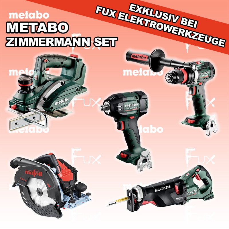 Heute auf dieses Produkt 21% Rabatt! Zu "Zimmermann Set" von Metabo FULL Service: 36 Monate zum Nulltarif für Sie! Weitere Infos zum FULL Service Dieses Produkt ist CAS kompatibel! Weitere Infos zu CAS Black Fuxday Aktionen FUX SPECIAL EXKLUSIV BEI FUX Metabo Zimmermann SET 7 SOLO Bestell- und Artikelnummer: Zimmermann SET 7 SOLO BS 18 LTX BL Q I Akku-BohrschrauberAkkuspannung 18 V Drehzahl 0-550 / 0-2000 U/min Drehmoment hart / weich 130 / 65 Nm Gewicht (mit Akkupack) 2.3 kgInfos SSW 18 LTX 550 BL Akku-SchlagschrauberAkkuspannung 18 V Anziehdrehmoment 550 Nm Werkzeugaufnahme 1/2" Gewicht ohne Akkupack 1,4 kgInfos SSEP 18 LTX BL MVT Akku-SäbelsägeAkkuspannung 18 V Hubzahl bei Leerlauf 0 - 3.000 /min Gewicht (mit Akkupack) 4.6 kgInfos HO 18 LTX 20-82 Akku-Einhand-HobelAkkuspannung 18 V Hobelbreite 82 mm Spanabnahme einstellbar 0-2 mm Gewicht 3.5 KgInfos K 85 - 18 PURE Akku-Handkreissägen im L-MAXSchnitttiefe 0 – 88 mm Schnitttiefe bei 45° 0 – 61.5 mm Gewicht (mit Akku) 8.1 kgInfos Ergattere dir einen Akku bei der Registration auf metabo.ch Alle Produkte dieser Aktion anzeigen OHNE AKKUS UND LADEGERÄT Standard-Ausrüstung In diesem Set enthalten: BS 18 LTX BL Q I Akku-Bohrschrauber SSW 18 LTX 550 BL Akku-Schlagschrauber SSEP 18 LTX BL MVT Akku-Säbelsäge HO 18 LTX 20-82 Akku-Einhand-Hobel K 85 - 18 PURE Akku-Handkreissägen im L-MAX Listenpreis CHF 2'582.20 Fuxpreis CHF 2'040.00 inkl. 8.1% MwSt, inkl vRG Versand CHF 25.00 Kein Grauimport! Produkt bestellen 1 Stück 2 Stück 3 Stück 4 Stück 5 Stück 6 Stück 7 Stück 8 Stück 9 Stück 10 Stück Alle Angaben ohne Gewähr und solange Vorrat reicht!Wiederverkäufer werden? Produkt als PDF NEUHEITAKTION 21%