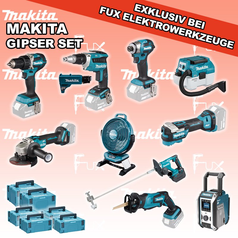 Makita Gipser Set 15 SOLO DDF484ZJ Akku-Bohrschrauber DFS452ZJ Akku-Trockenbau-Schrauber DUT130Z Akku-Rührgerät DTD173Z Akku-Schlagschrauber DVC750LZX1 Akku-Staubsauger DGA506ZJ Akku-Winkelschleifer DMR115 Akku Radio DAB / DAB+ / FM / Bluetooth® DJR183Z Akku-Säbelsäge MAKPAC Gr. 3 Einsatz für DTM52 MAKPAC Gr. 2 Einsatz für diverse Schlagschrauber Einsatz für DJR183 Magazinschraubenvorsatz