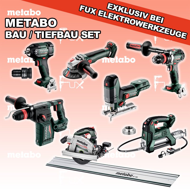 Zu "Bau / Tiefbau Set" von Metabo FULL Service: 36 Monate zum Nulltarif für Sie! Weitere Infos zum FULL Service FUX SPECIAL EXKLUSIV BEI FUX Metabo Bau / Tiefbau Set 8 SOLO Bestell- und Artikelnummer: Bau / Tiefbau Set 8 SOLO BS 18 LTX BL Q I Akku-BohrschrauberAkkuspannung 18 V Drehzahl 0-550 / 0-2000 U/min Drehmoment hart / weich 130 / 65 Nm Gewicht (mit Akkupack) 2.3 kgInfos ST 18 LT 130 BL Akku-StichsägeAkkuspannung 18 V Hubzahl 1000-3.500 /min Gewicht ohne Akkupack 1.5 kgInfos KH 18 LTX BL 24 Q Akku-KombihammerAkkuspannung 18 V Einzelschlagstärke 2.2 J Bohrleistung in Beton 24 mm Gewicht ohne Akkupack 3 kgInfos WVB 18 LT BL 11-125 Quick Akku-WinkelschleiferAkkuspannung 18 V Drehzahl 2.800 - 10.000 / min Ø 125 mm Scheiben Gewicht (mit Akkupack) 2.5 kgInfos SSW 18 LTX 550 BL Akku-SchlagschrauberAkkuspannung 18 V Anziehdrehmoment 550 Nm Werkzeugaufnahme 1/2" Gewicht ohne Akkupack 1,4 kgInfos FP 18 LTX Akku FettpresseAkkuspannung 18 V Maximaler Druck 690 bar Auspressgeschwindigkeit 100 / 290 ml/min Gewicht inkl. Akku 4.4 kgInfos KS 18 LTX 66 BL Akku HandkreissägeAkkuspannung 18 V Schnitt-Tiefe bei 90° 0-66 mm Sägeblatt 165 mm Gewicht 4.5 kgInfos FS 160 FührungsschieneGesamtlänge 1600 mmInfos Adapter für Lube-Shuttle® 400GAdapter zum Umrüsten von Fettbehälter auf Lube-Shuttle®* Kartusche 400g geeignet für FP 18 LTXInfos Adapter mit 1/2“ auf 1/4"Adapter mit 1/2“ Innenvierkant maschinenseitig und 1/4“ Innensechskant für schlagfeste Einsatzwerkzeuge mit 1/4“ SchaftInfos Registriere die in diesem Set vorhandenen Metabo Maschinen auf metabo.ch, und ergattere dir bis zu 5 Gratis Akkus!Zusätzlich offerieren wir zu diesem Set einen Gratis Akku!OHNE AKKUS UND LADEGERÄT Standard-Ausrüstung In diesem Set enthalten: BS 18 LTX BL Q I Akku-Bohrschrauber ST 18 LT 130 BL Akku-Stichsäge KH 18 LTX BL 24 Q Akku-Kombihammer WVB 18 LT BL 11-125 Quick Akku-Winkelschleifer SSW 18 LTX 550 BL Akku-Schlagschrauber FP 18 LTX Akku Fettpresse KS 18 LTX 66 BL Akku Handkreissäge FS 160 Führungsschiene Adapter für Lube-Shuttle® 400G Adapter mit 1/2“ auf 1/4" Listenpreis CHF 2'636.00 Fuxpreis CHF 1'802.00 inkl. 8.1% MwSt, inkl vRG Frankolieferung Kein Grauimport! Produkt bestellen 1 Stück 2 Stück 3 Stück 4 Stück 5 Stück 6 Stück 7 Stück 8 Stück 9 Stück 10 Stück Alle Angaben ohne Gewähr und solange Vorrat reicht!Wiederverkäufer werden? Produkt als PDF NEUHEITAKTION 31%