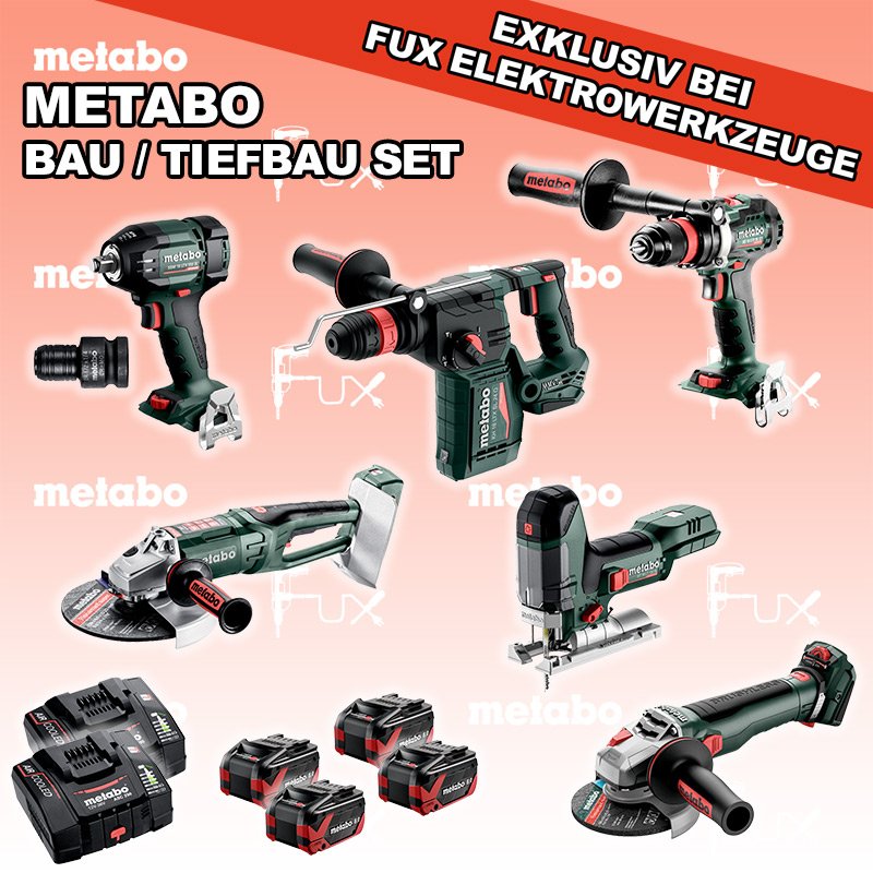 Metabo Bau / Tiefbau Set 10 BS 18 LTX BL Q I Akku-Bohrschrauber ST 18 LT 130 BL  Akku-Stichsäge KH 18 LTX BL 24 Q Akku-Kombihammer WVB 18 LT BL 11-125 Quick Akku-Winkelschleifer WPB 36-18 LTX BL 24-230 Akku-Winkelschleifer SSW 18 LTX 550 BL Akku-Schlagschrauber 18 V, 8.0 Ah Akkupack (LiHDX Akkus) ASC 290 Air Cooled" Ladegerät Adapter mit 1/2“ auf 1/4"