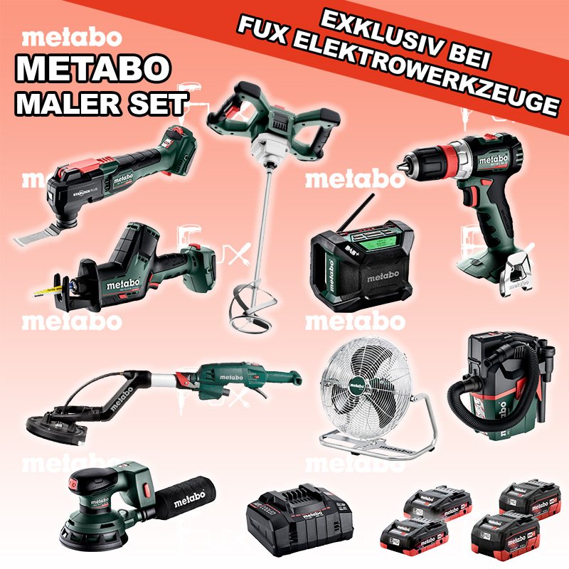 Zu "Maler Set" von Metabo FULL Service: 36 Monate zum Nulltarif für Sie! Weitere Infos zum FULL Service FUX SPECIAL EXKLUSIV BEI FUX Metabo Maler Set 6 Bestell- und Artikelnummer: Maler Set 6 BS 18 L BL Q Akku-BohrschrauberAkkuspannung 18 V Drehzahl 0 - 500 / 0 - 1700 /min Drehmoment hart / weich 60 / 28 Nm Gewicht (mit Akkupack) 1.3 kgInfos RW 18 LTX BL 120 Akku-RührwerkAkkuspannung 18 V Max. Rührkorb-Durchmesser 120 mm Max. empfohlene Mischmenge 30 l Werkzeugaufnahme Innengewinde M 14 Infos AS 18 L PC Compact Akku-Sauger Akkuspannung 18 V Luftleistung max. 2100 l/min Unterdruck 120 hPa (mbar) Behältervolumen 6 lInfos R 12-18 DAB+ BT Akku-BaustellenradioDAB+ Akkuspannung 12 V / 18 V Extreme Akkupacks mit 14,4 und 18 Volt Gewicht 1.85 kgInfos SSE 18 LTX BL Compact Akku-SäbelsägeAkkuspannung 18 V Hubzahl 0-3000 min-1 Hublängen 16 mm Gewicht (mit Akkupack) 1.8 kgInfos MT 18 LTX BL QSL Akku-Multitool Akkuspannung 18 V Schwingzahl bei Leerlauf 8.000 - 20.000 /min Schleifplatte, Maß Eck zu Eck 93 mm Gewicht 1.7 kgInfos AV 18 Akku-VentilatorAkkuspannung 18 V Max. Luftgeschwindigkeit 3,8 m/s Flügeldurchmesser 355 mm Gewicht (mit Akkupack) 1,2 kgInfos SXA 18 LTX 125 BL Exzenterschleifer Akkuspannung 18 V Durchmesser des Stütztellers 125 mm Leerlaufdrehzahl 4000 - 10000 /min Gewicht (mit Akkupack) 1.7 kg Infos LSV 5-225 Comfort LanghalsschleiferLeistungsaufnahme 500 Watt Durchmesser Schleifteller 225 mm Leerlaufdrehzahl 1000 - 1650 min-1 Gewicht 4.5 kgInfos 2 x 18 V, 4.0 Ah, LiHD Akkupack18 V 4.0 Ah ( LiHD Akkus ) Infos 2 x 18 V, 5.5 Ah, LiHD Akkupack18 V 5.5 Ah ( LiHD Akkus ) Infos ASC 145, 12 - 36 V "Air Cooled" LadegerätZum Aufladen aller Li-Power Schiebesitz-Akkupacks (12 V - 36 V). Ladestrom 8.0 AInfos Registriere die in diesem Set vorhandenen Metabo Maschinen auf metabo.ch, und ergattere dir bis zu 5 Gratis Akkus!Zusätzlich offerieren wir zu diesem Set einen Gratis Akku! Standard-Ausrüstung In diesem Set enthalten: BS 18 L BL Q Akku-Bohrschrauber RW 18 LTX BL 120 Akku-Rührwerk AS 18 L PC Compact Akku-Sauger R 12-18 DAB+ BT Akku-Baustellenradio SSE 18 LTX BL Compact Akku-Säbelsäge MT 18 LTX BL QSL Akku-Multitool AV 18 Akku-Ventilator SXA 18 LTX 125 BL Exzenterschleifer LSV 5-225 Comfort Langhalsschleifer 2 x 18 V, 4.0 Ah, LiHD Akkupack 2 x 18 V, 5.5 Ah, LiHD Akkupack ASC 145, 12 - 36 V "Air Cooled" Ladegerät Listenpreis CHF 3'392.00 Fuxpreis CHF 2'452.00 inklusive 8.1% MwSt Frankolieferung Kein Grauimport! Produkt bestellen 1 Stück 2 Stück 3 Stück 4 Stück 5 Stück 6 Stück 7 Stück 8 Stück 9 Stück 10 Stück Alle Angaben ohne Gewähr und solange Vorrat reicht!Wiederverkäufer werden? Produkt als PDF NEUHEITAKTION 27%