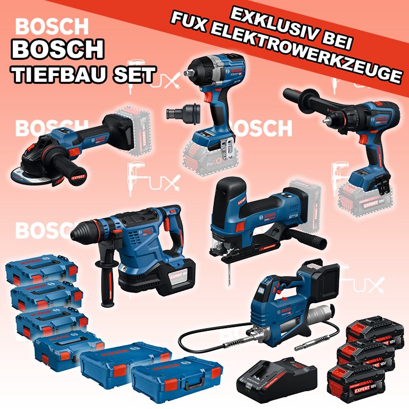 Das Ladenlokal bleibt vom 23. Februar 2026 bis am 28. Februar 2026 geschlossen. Bestellungen und Lieferungen von Neugeräten werden trotz Ferienabwesenheit in gewohnter Fux-Manier entgegengenommen und ausgeliefert. Zu "Bau / Tiefbau Set" von Bosch Professional FUX SPECIAL EXKLUSIV BEI FUX Bosch Expert EXTiefbau Set 2 Bestell- und Artikelnummer: EXTiefbau Set 2 5 Jahre Garantie auf Bosch Expert Maschinen EXSR18V-150 Akku-BohrschrauberAkkuspannung 18 V Drehmoment 84 / 100 / 150 Nm Leerlaufdrehzahl 0 – 550 / 0 – 2200 min⁻¹ Gewicht exkl. Akku 2.1 kgInfos EXBH18V-32F Akku-BohrhammerAkkuspannung 18 V Nenn-Schlagenergie 4.5 J Schlagzahl bei Nenndrehzahl 4300 bpm Nenndrehzahl 0 – 790 min⁻¹ Gewicht exkl. Akku 4.2 kgInfos EXST18V-155S Akku-StichsägeAkkuspannung 18 V Hubzahl bei Leerlauf 800 - 3800 min⁻¹ Hubhöhe 26 mm Gewicht exkl. Akku 1.9 kgInfos EXWS18V-15S Akku-WinkelschleiferAkkuspannung 18 V Leerlaufdrehzahl 11000 min⁻¹ Scheiben-Ø 125 mm Gewicht exkl. Akku 2.2 kgInfos GDS 18V-750 C Akku-DrehschlagschrauberAkkuspannung 18 V Drehzahlen 0 - 2400 min⁻¹ Drehmoment, max. 750 Nm Gewicht exkl. Akku 1.7 kgInfos GFP 18V-10 Akku-KartuschenpresseAkkuspannung 18 V Druck max. 9’999.9 psi Durchflussmenge bis 320 g/minInfos Reduktions Adapter 1/2" auf 1/4" Aufnahme Max. 350 Nm Länge 45 mmInfos 3x EXBA18V-80 + EXAL18V-160 Starter-Set3 x EXBA18V-80 Akkupack EXAL18V-160 LadegerätInfos Standard-Ausrüstung In diesem Set enthalten: EXSR18V-150 Akku-Bohrschrauber EXBH18V-32F Akku-Bohrhammer EXST18V-155S Akku-Stichsäge EXWS18V-15S Akku-Winkelschleifer GDS 18V-750 C Akku-Drehschlagschrauber GFP 18V-10 Akku-Kartuschenpresse Reduktions Adapter 3x EXBA18V-80 + EXAL18V-160 Starter-Set Geliefert im Koffer Zubehör Listenpreis CHF 3'217.00 Fuxpreis CHF 2'462.00 inklusive 8.1% MwSt Kostenloser Versand Kein Grauimport! Produkt bestellen 1 Stück 2 Stück 3 Stück 4 Stück 5 Stück 6 Stück 7 Stück 8 Stück 9 Stück 10 Stück Alle Angaben ohne Gewähr und solange Vorrat reicht! Produkt als PDF NEUHEITAKTION 23%